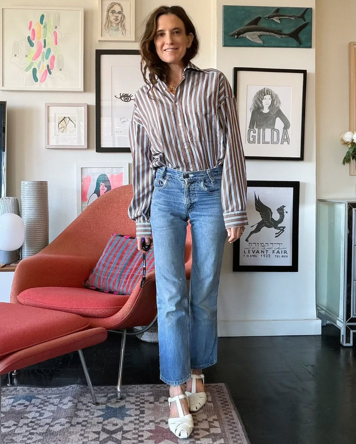 I have more button-downs (or button-ups, as some insist) than I can count. Classic men’s ones, old tuxedo shirts—Here’s a good new one, striped, solid, you name it. I like them unbuttoned sometimes to show a peek of a pretty bra (code: ANDREAVIP30), or closed all the way to the top. Cuffs down and loose, or rolled up past the elbows. And I wear them with just about any bottom you can think of, tucked in or out, even over a slip dress. So first up, we have my new striped number from WNU, that’s got the charm of a menswear style, with a bit of a drape. The jeans are vintage Levi’s (new pair here, and these Mavis have a nice, wider leg). Here are the cream patent-leather slingbacks (cute with gray socks, too). And these have a similar vibe with a little heel.