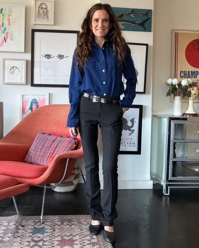 I just got this 4 Objects work shirt in the very cool indigo (I wear the chambray and wool versions on repeat). I would normally throw it on with jeans (these goodies are on their way to me as I write, and I've been liking this bootcut style lately), the skinny black Saint Laurent trousers are another score from Pilgrim (how about these or these with a bit more of a flare?), and super-cute, comfy Beek slingbacks (code: ANDREA10). The western-style belt is from The RealReal, but here’s a great option, and this one has a cool texture.