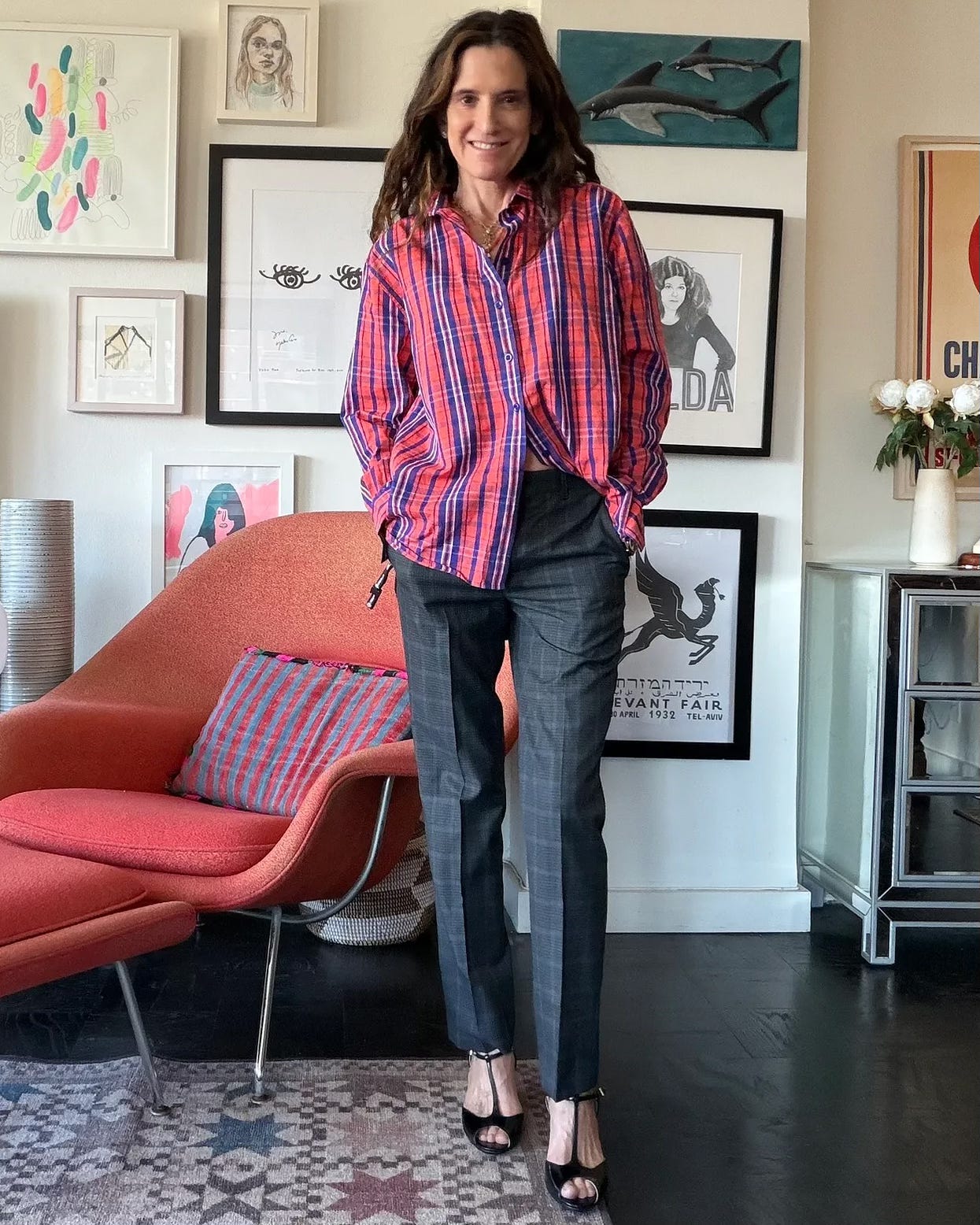 I’ve been on tenterhooks waiting for this perfect plaid cotton shirt ever since I saw Nikki Kule sporting it at the spring preview months and months ago (it comes with a matching bandana!). I thought it would be cute with my old Brooks Brothers boys’ tropical wool plaid trousers for a subtle clash. More pant options: Veronica Beard’s linen version, which is a bit sexier than mine; these wider menswear ones, and this silk pair from Theory, that’s a little bolder. Those are the Prada-esque Pêche shoes I wrote about last week (I love them more than ever).