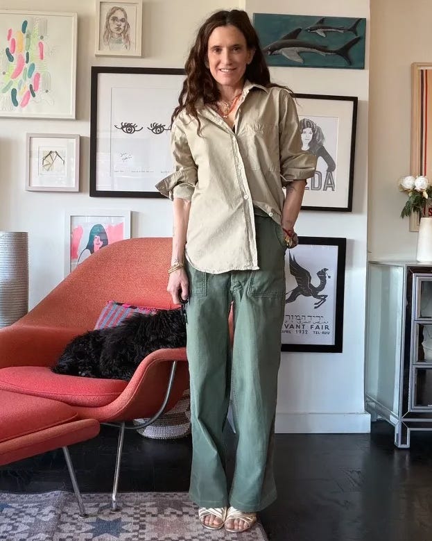 And I love Ozma’s sand button-down with my vintage army pants. You can get a just-as-fab new pair from Outerknown, and I like the idea of these, an off-white carpenter pant like this, or classic white jeans. I added the gold mules my friend Anne turned me on to just to elevate everything a smidge (they run big, go down a size!). I would do my Loeffler Randalls, too, btw.